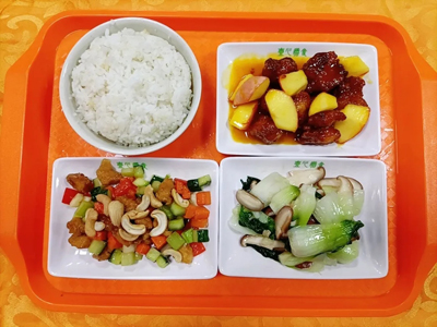 健康营养餐样例(苹果橙汁骨+腰果五彩鸡丁+香菇小唐菜+香米饭)(李荣邦 摄)