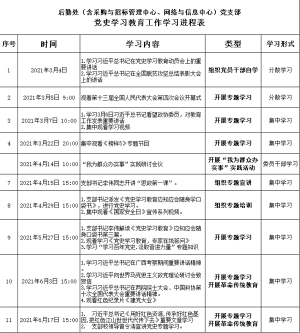 至党史学习以来,后勤处(含采购与招标管理中心、网络与信息中心)党支部,采取集中学习和分散学习的方式,积极主动组织全体党员干部、积极分子和群众“学党史悟思想 办实事 开新局”,在本职本岗,以优异成绩迎接建党一百周年。截止6月17日,支部已举办11场党史学习活动。
