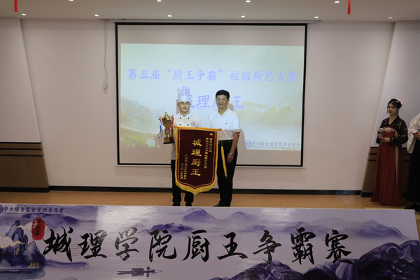 本次大赛的重头戏仍是厨王的最终对决,本次厨王烹饪比拼以“城理味道”为主题,各食堂大厨自选食材,在规定的20分钟烹饪时间内完成菜品的制作。随着出菜铃声的响起,本年度厨王比拼的四道菜式也掀开了神秘的面纱,第一食堂的柠汁蒜香骨、第二食堂的茶叶虾、第三食堂的金丝罐汤虾球、第四食堂的鲫鱼粉卷一一登台亮相,由现场的嘉宾评委和学生大众评委一同品尝。最终,第四食堂烹制的“鲫鱼粉卷”得到师生评委们的一致好评,徐祯华厨师得分最高,赢得“2021年度城理厨王”的荣誉称号,第四食堂卫冕了厨王的荣誉。学校党委书记杜小明为其颁发锦旗与奖杯。
