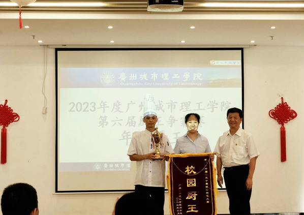 本次大赛最受瞩目的食堂厨师比拼赛共分为两轮,第一轮由学校四家食堂的大厨以“健康美味”为主题进行特色菜比拼,随着出菜铃声的响起,四位厨师的第一道比赛菜式闪亮登场,第一食堂的糖醋排骨,第二食堂的黄桃锅包肉,第三食堂的脆皮杏仁虾滑,第四食堂的金瓜虾仁蒸旦,四道精美佳肴让人目不暇接,现场美食评委对菜品进行“色、香、味、形”的评分,得分最高的第三食堂的吴瑞荣厨师、第四食堂的罗杰厨师成功晋级,进行校园厨王的角逐。在第二轮菜式比拼赛中,第三食堂的吴瑞荣厨师制作出芳香四溢的鲍汁炒牛柳,第四食堂的罗杰厨师烹饪出让人食指大动的新派猪扒卷,在美食评委的品尝评分后,最终菜式新派猪扒卷更胜一筹,罗杰厨师荣获2023年度“校园厨王”的荣誉称号。杜小明书记为其颁发锦旗与奖杯。